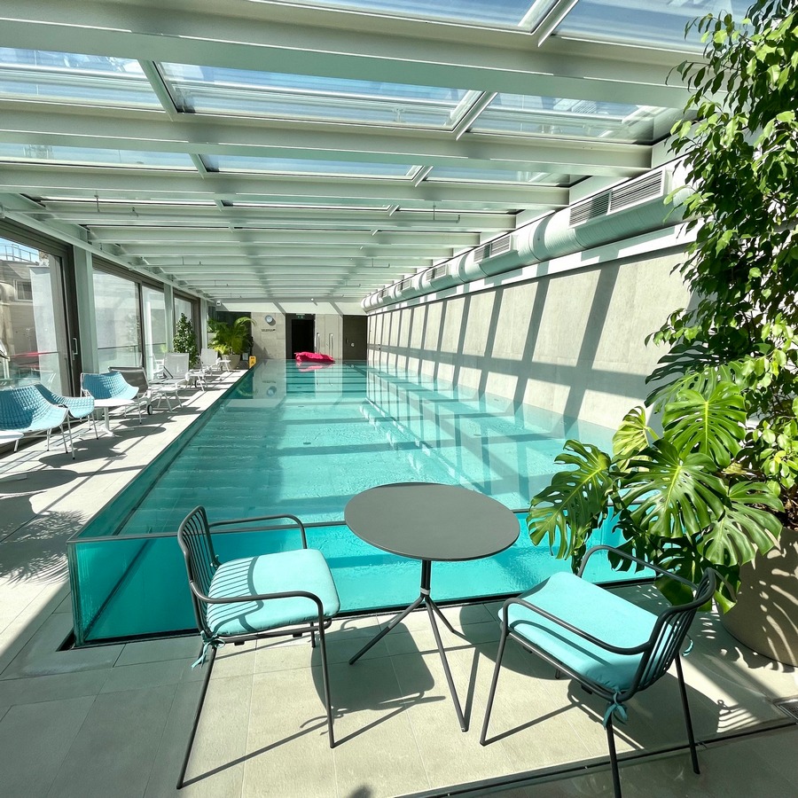 - Indoor rooftop pool with city view