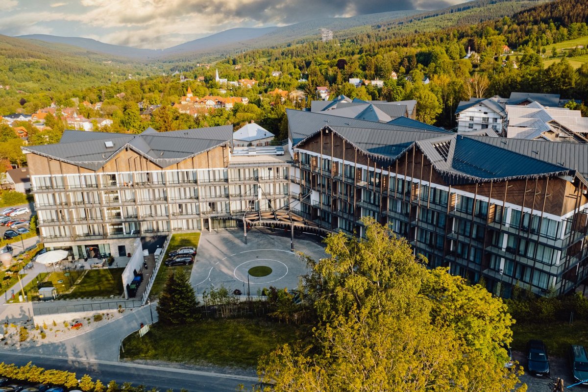 This spa hotel, surrounded by the atmospheric scenery of the Jizera Mountains, is located in the city of Świeradów-Zdrój. It is a spa town in the south of Poland in the Lower Silesian Voivodeship near the border with the Czech Republic. It is possible to carry out a whole range of activities there – from hiking, all kinds of games, to water fun. The hotel building has a unique geometric layout (the wings of the building form an angle of 120 degrees between them) and as such fits well into the surrounding landscape of the historical Sudetenland. The hotel offers its own restaurant, lobby bar, animation programs for children and adults, a games room with interactive toys, and a swimming pool and sauna complex.
